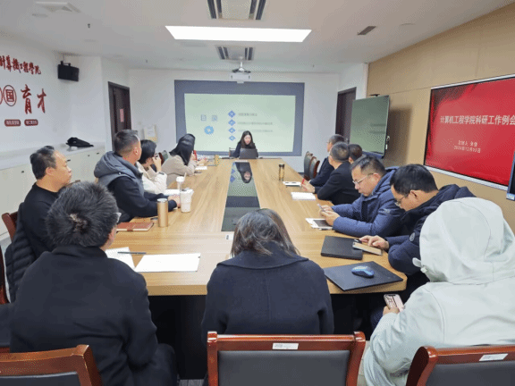在科技楼2-523召开科研工作例会,会议由学院副院长朱俊主持,学院院长胡勇、学院博士教师参加会议。