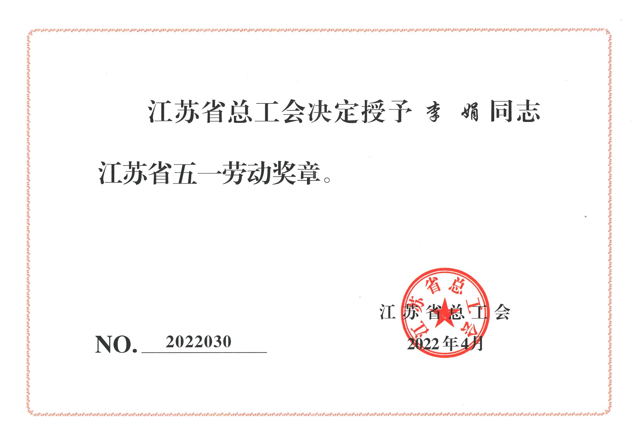 喜报:我院李娟老师被江苏省总工会授予江苏省五一劳动奖章