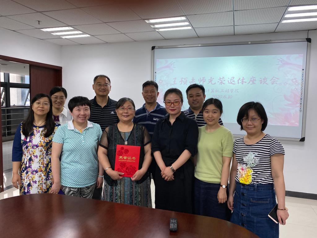 6月10日下午,计算机学院分工会为刚刚退休的副教授王预老师举办了光荣退休座谈会,院党委书记陈冠亚、副书记陈莉莉、副院长苏守宝、徐永华出席了座谈会,王预老师所在系和课程组的部分年轻老师参加。