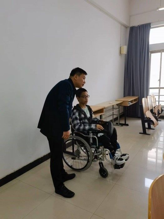 同学们在互相了解的过程中,发现了班上有一位“特殊”的同学——周伟。他来自无锡江阴,因病导致下半身瘫痪,所有出行均需要借助轮椅。由于大一的公共课程大部分集中在没有电梯的南区教学楼,上下楼梯成为了周伟的“烦心事”。