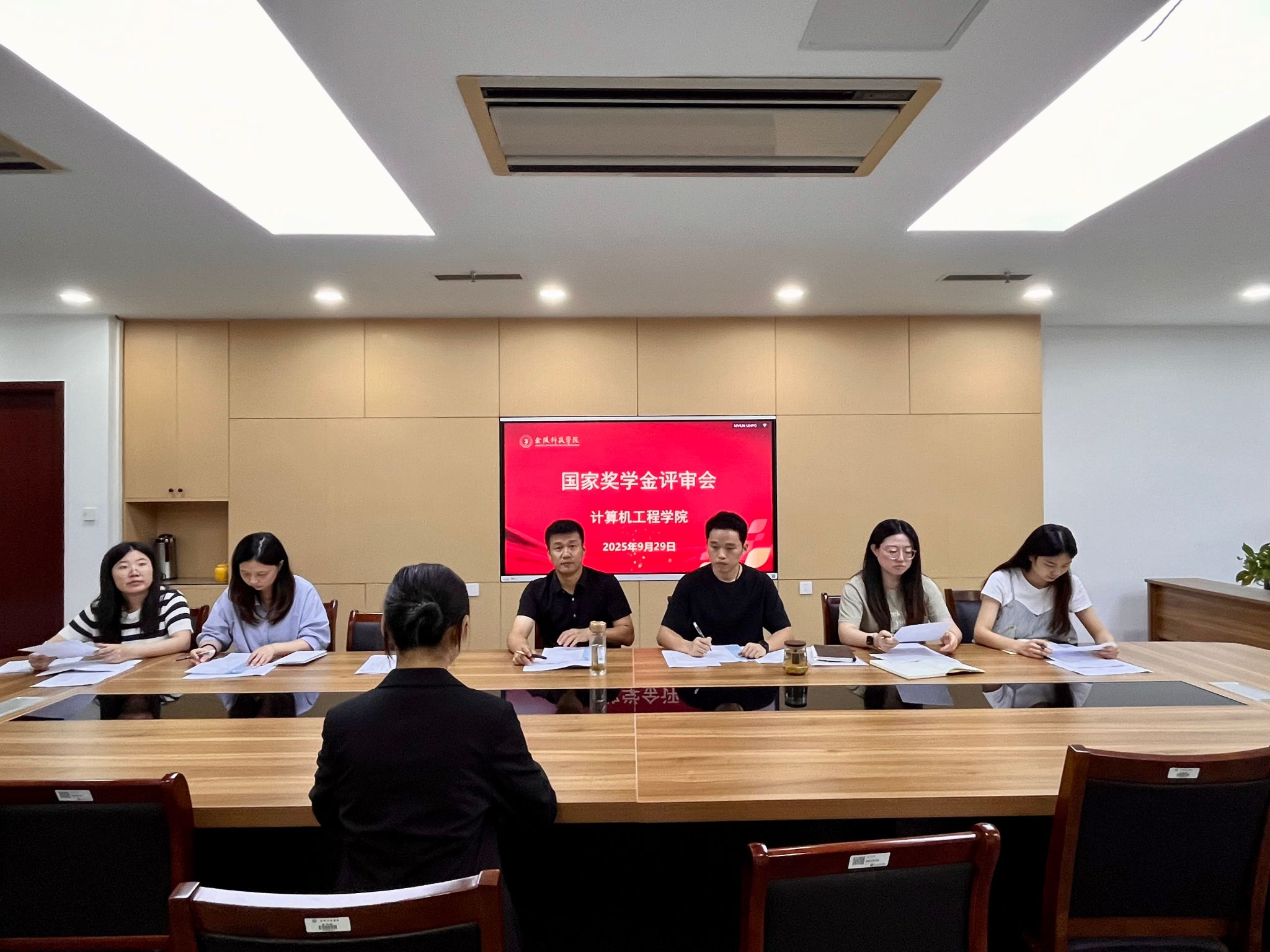 于科技楼2号楼523会议室召开国家奖学金候选人评审会,对学院内符合评选条件的10名候选人进行综合评议。