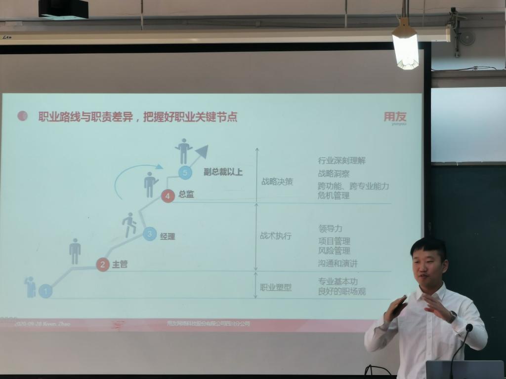 接着,赵文睿围绕“职业中的基础经验”阐述了企业中的职业关键节点和基础知识,指出在规划职业生涯前需要了解职业路线与职责差异,通过鱼骨理论、MECE、WBS、80/20等说明基本软件技能用以提升职业竞争力的主要关键能力。另外,赵文睿还强调了跨专业能力的重要性,只有让自己不断学习,才能不断进步,跟上时代的步伐,真正做一个有用的人。