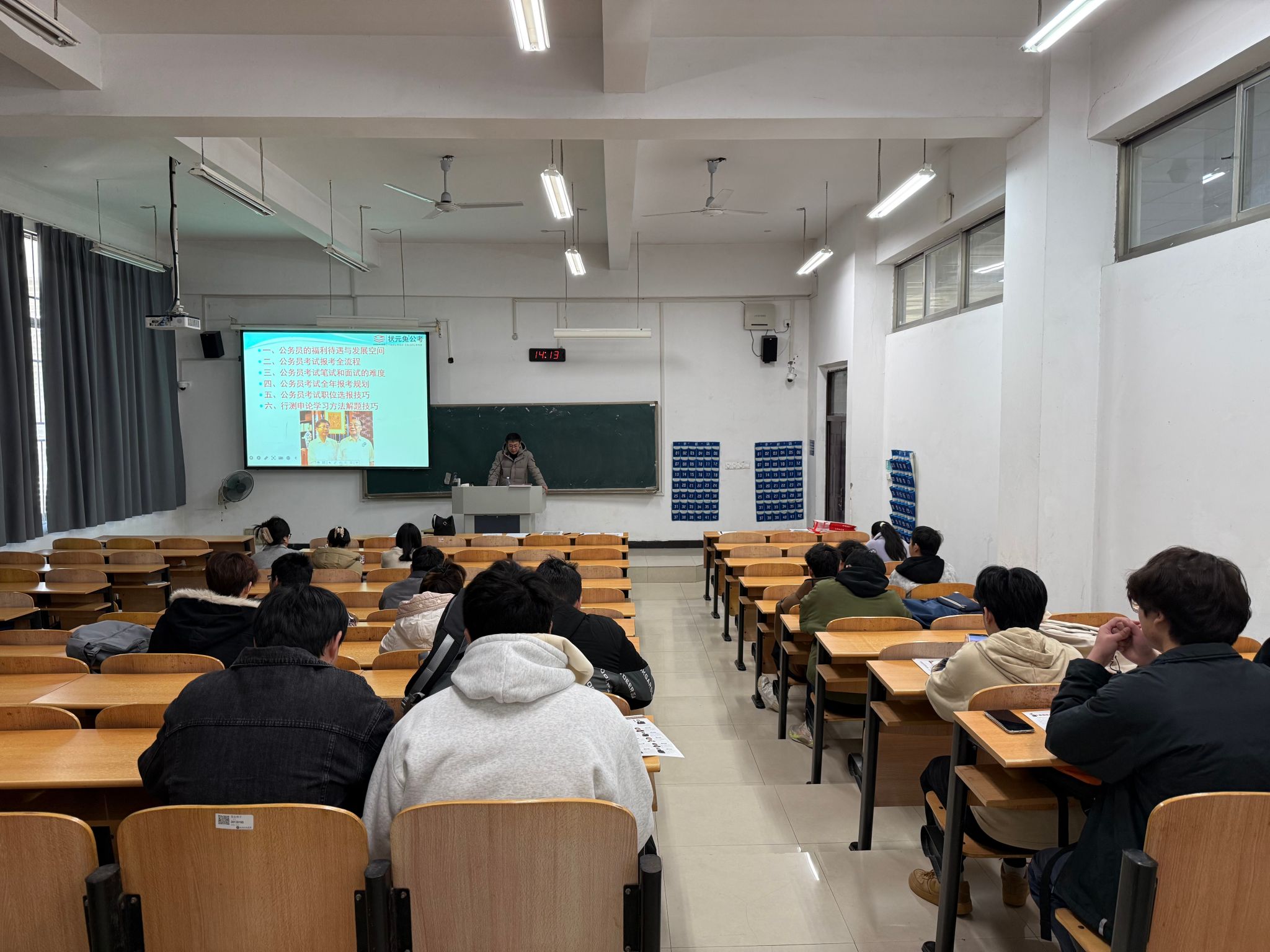 黄老师从公务员的福利待遇与发展空间、公务员考试报考全流程、公务员考试笔试和面试的难度、公务员考试全年报考规划、公务员考试职位选报技巧、行测申论学习方法解题技巧等6个方面进行了全方位的深度解析,不仅分享了考试的硬核知识,更是对考试心态和学习方法提出了建设性的建议,帮助学生们构筑起清晰的备考路线图。讲座结束后,同学们纷纷表示,通过此次讲座,自己对公务员考试有了更加深入地了解,也收获了许多宝贵的备考经验。