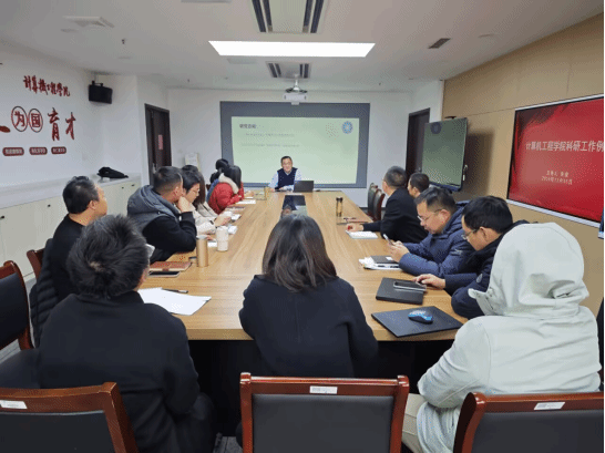 在科技楼2-523召开科研工作例会,会议由学院副院长朱俊主持,学院院长胡勇、学院博士教师参加会议。