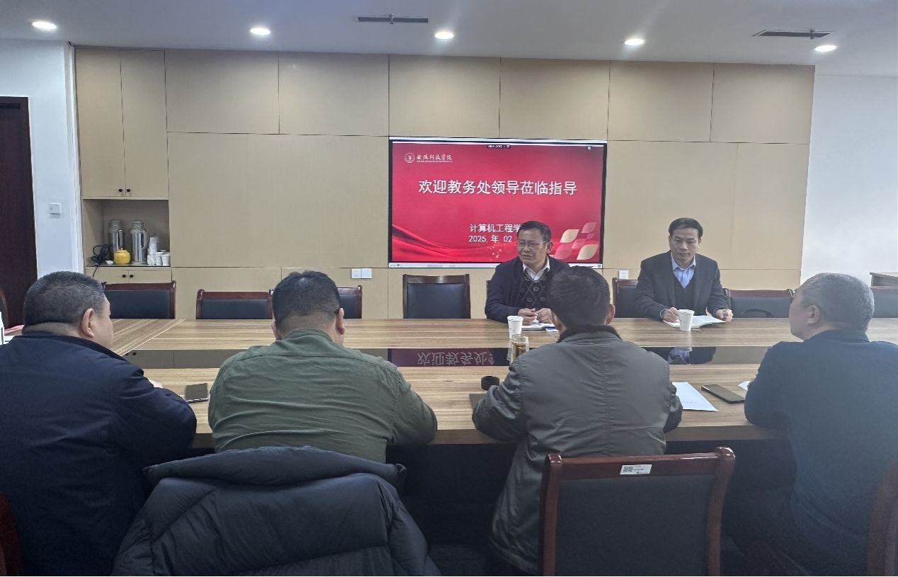 2025年2月26日上午,教务处处长田祥宏、副处长刘旭明莅临我院指导教学工作,院长胡勇、副院长王强、各专业负责人、各系部主任、教务秘书共同参加,重点围绕人工智能通识课程的设置、国一流专业验收工作进展以及人工智能赋能专业建设的未来规划展开深入研讨。