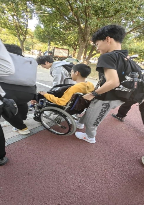 同学们在互相了解的过程中,发现了班上有一位“特殊”的同学——周伟。他来自无锡江阴,因病导致下半身瘫痪,所有出行均需要借助轮椅。由于大一的公共课程大部分集中在没有电梯的南区教学楼,上下楼梯成为了周伟的“烦心事”。