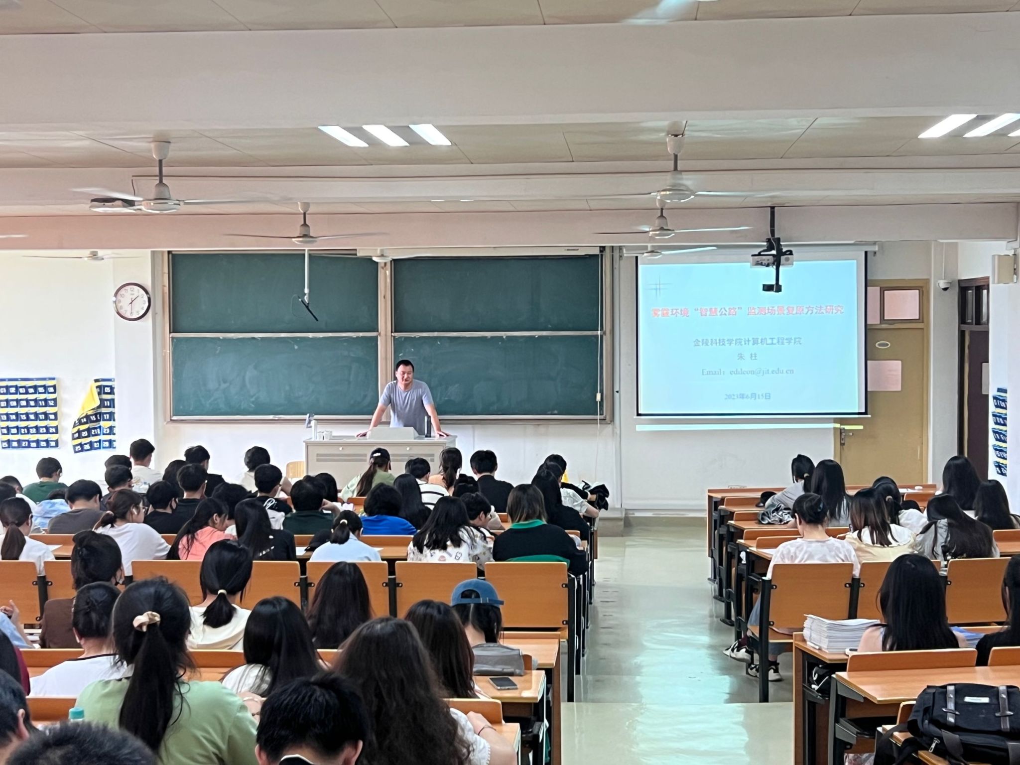 此次交流的主题是“雾霾环境‘智慧公路’监测场景复原方法研究”。朱教授为学生们详细介绍了智慧交通和智慧公路项目的研究背景,向同学们展示了该项目的研究现状“雾霾监测场景复原”,解说了复原方法研究的目标与内容以及现阶段研究工作以及下一段研究的目标。