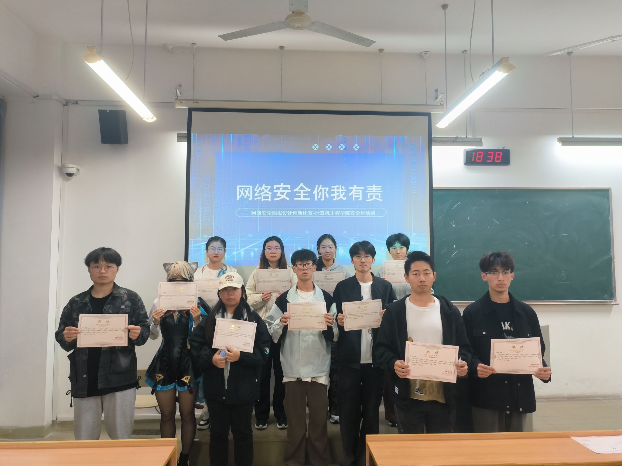 全体学生征集以海报和漫画为主要形式的作品。参赛者通过生动的图像和鲜明的色彩,将网络安全的重要性及防范技巧融入其中。比赛共收到作品19 幅,经过线上线下评比共选出一等奖 2 名,二等奖 4名,三等奖 8 名。由学院向获奖选手颁发了奖品和奖状。